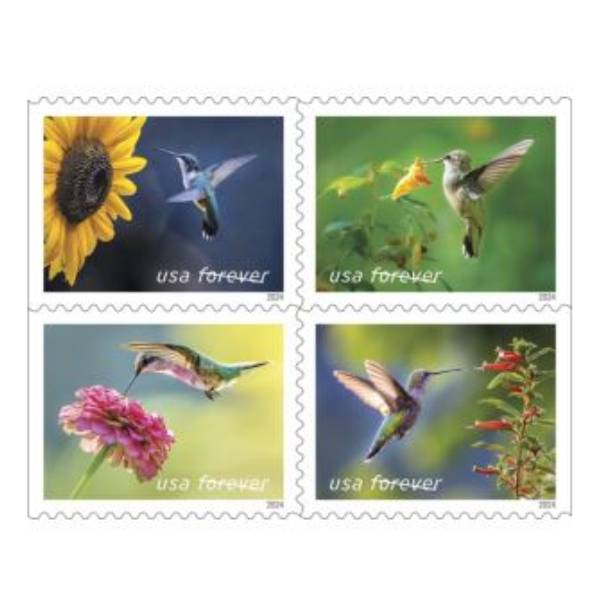 Each stamp features a close-up photograph of a single, female ruby-throated hummingbird hovering next to a colorful bloom, a zinnia, cigar flower, spotted touch-me-not, or sunflower.