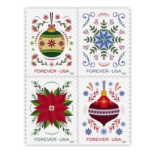 Celebrate the holidays with four stamps from the U.S. Postal Service. These festive, folk art-inspired stamps are sure to enliven your 2024 holiday mailings.