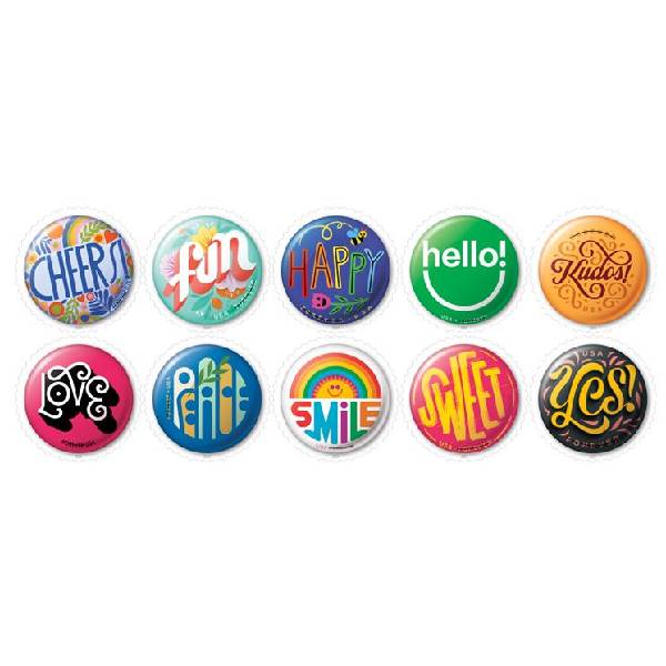 Add cheery, whimsical flair to your cards and letters with the vibrant Pinback Buttons Forever stamps.