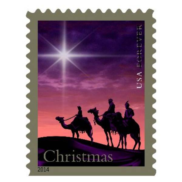 - The stamp depicts the Magi atop camels as they ride through the desert at dawn. The star that guides them is seen in the sky.