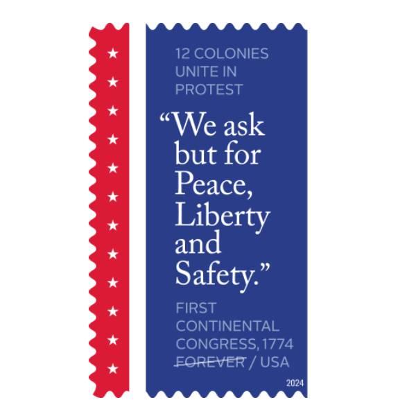 The stamp features 12 white stars that represent the number of Colonies present at the First Continental Congress. It also includes the words “12 COLONIES UNITE IN PROTEST” followed by a plea taken from a petition sent by the Congress to King George III on October 25, 1774: “We ask but for Peace, Liberty and Safety.”